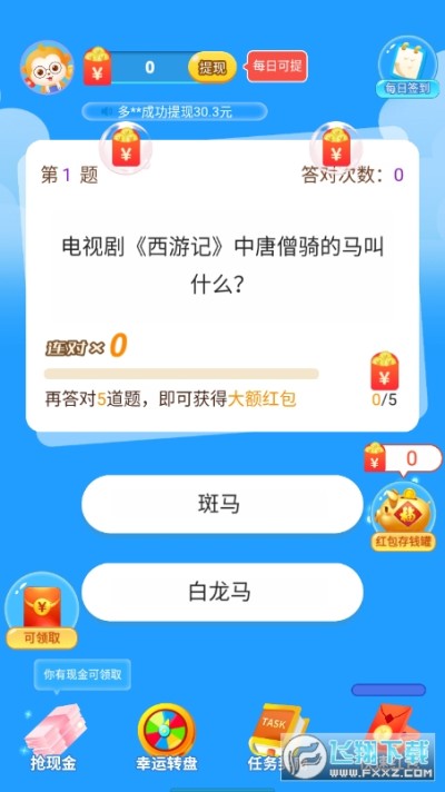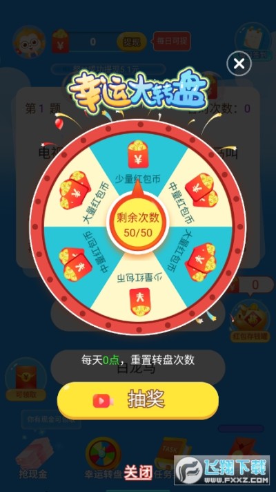 开心答题王手游是一款最新的休闲答题闯关类游戏,游戏中有着海量的关卡内容等你挑战,游戏考验玩家的脑力以及反应力,还能参与幸运转盘每天免费抽奖,超多赚钱分红任务等你完成。对游戏感兴趣的话不妨点击下载试试!
