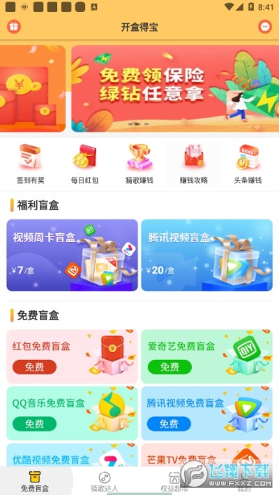 用户可以免费抽取腾讯视频、爱奇艺、芒果tv等视频会员权益,或通过猜歌、抽盲盒等方式赚取金币
