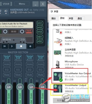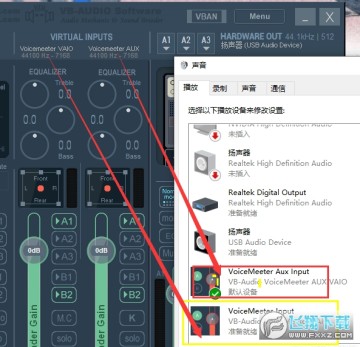 (安装完vb之后,打开声音设备,输入和输出会多出两个vb设备)这是它两个虚拟输入端口,以是否有aux来区分。这里选择带aux的作为输入口,点击设为默认值,这样电脑的声音就流入了这根管道