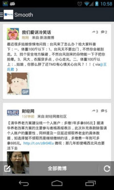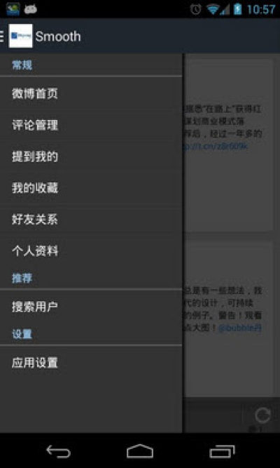 Smooth是新浪微博手机客户端的简约版本,相比较传统客户端,其界面更加的简洁流畅,给人一种别样的风格体验,对于不喜欢原版的朋友可以来试试这个版本哟!