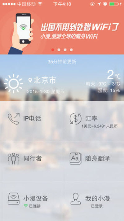 小漫WiFi是一个非常实用的生活服务类手机软件,除了满足用户的免费上网需求外,还为大家提供了各种旅行资讯服务,如天气、汇率、翻译和旅游攻略等的查询,是大家旅行在外的必备工具!