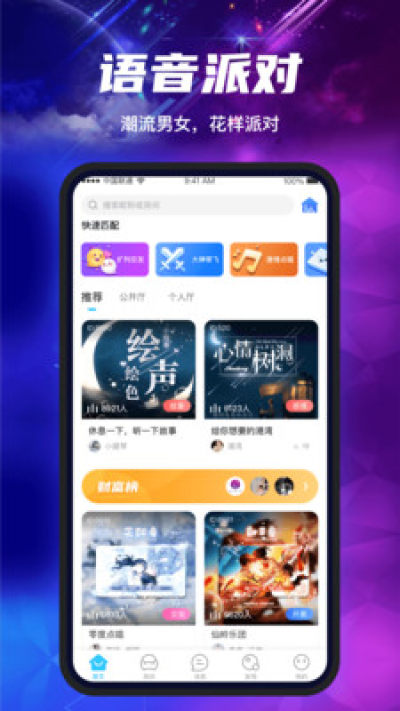 塔塔声吧app是一款以声音为媒介打造的手机移动社交服务平台,这款软件为各位用户提供了在线沉浸式社交的新玩法,在塔塔声吧app上你可以通过声音去认识更多的人,也能自己组局,找到更多的人一起玩,超多的社交新玩法等你来体验哦!