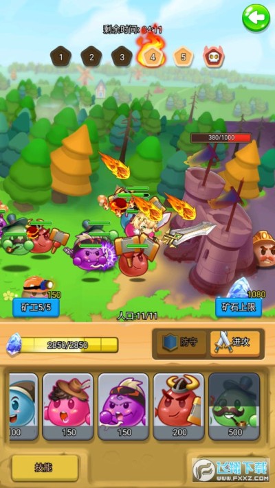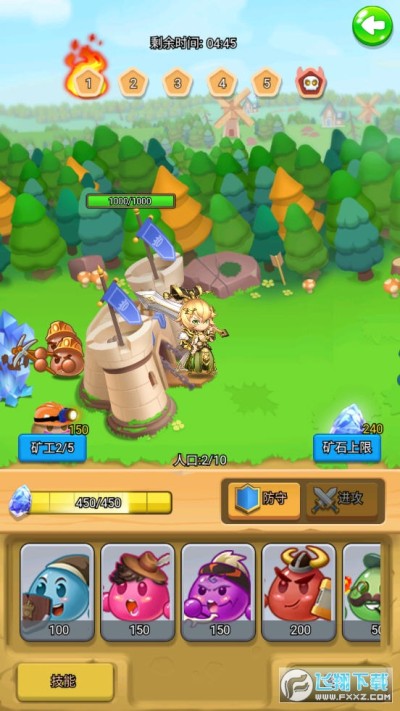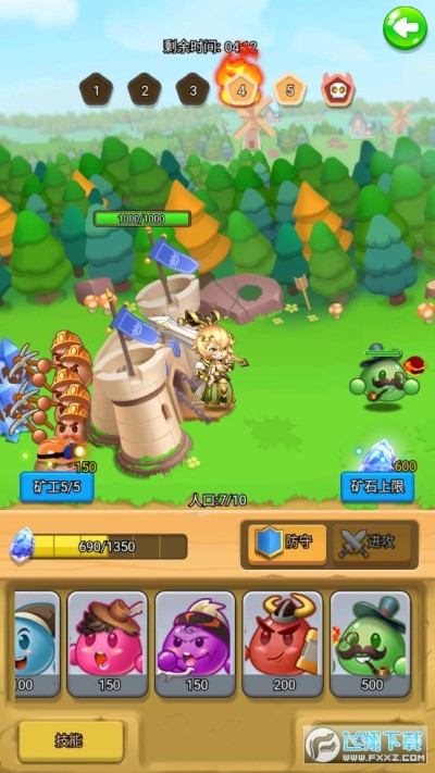 3、不断的挖掘砖石来升级团子们的战斗力,不断的变强来消灭所有敌人保护自己的家园。