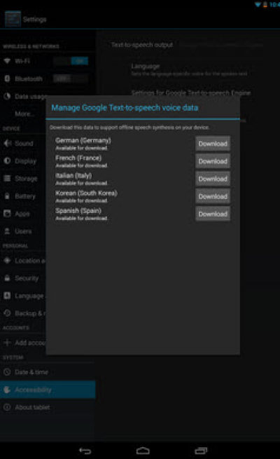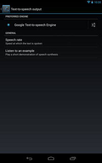 要在您的 Android 设备上使用 Google 文字转语音引擎,请转至“设置”>“语言和输入法”>“文字转语音输出”,然后选择“Google 文字转语音引擎”作为首选引擎。