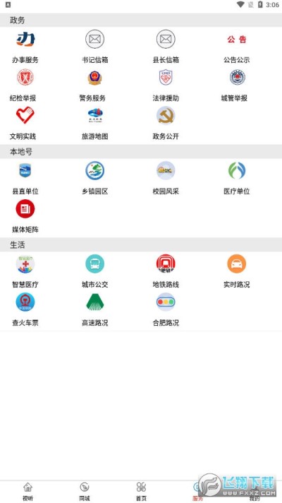 3、资讯:城市动态、通知公告、办事指南、安全防范。