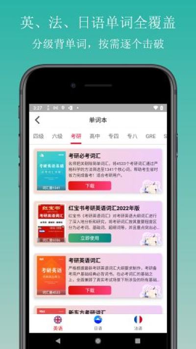 小语种支持日语支持N5~N1词汇,支持法语大学、TEF词汇;