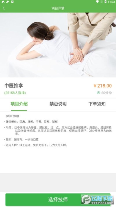 您可自选技师并查看技师的详细介绍(距离、头像、从业经验、状态、评论),项目、下单、支付的。