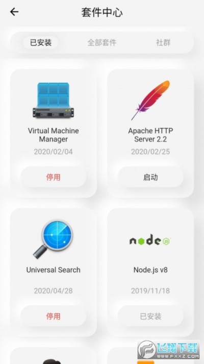查看全部套件、社群套件、已安装套件,启用/停用套件,安装/卸载套件。