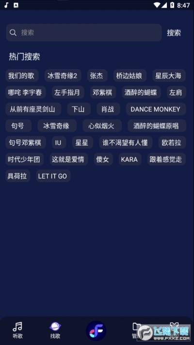 4、打开Fly Music搜索你喜欢的音乐即可,在首页歌单里面可以查看你喜欢听的歌曲