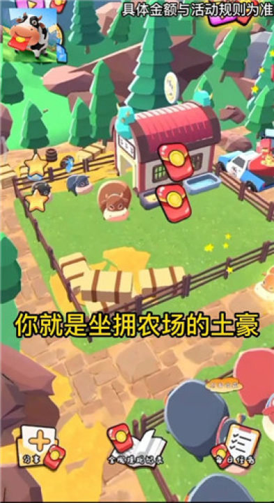《牛牛大农场牛赚红包版》是一款以农场经营为主题的手机游戏。玩家在游戏中可以通过养殖牛牛来体验经营的特色,赢取游戏中的红包奖励!喜欢玩经营游戏的小伙伴们快来领取自己的牛牛来进行养殖吧!