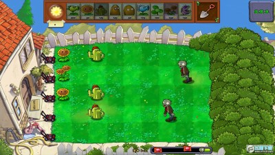 3、界面左方显示为植物塔防,僵尸从右方向你的房子进攻;