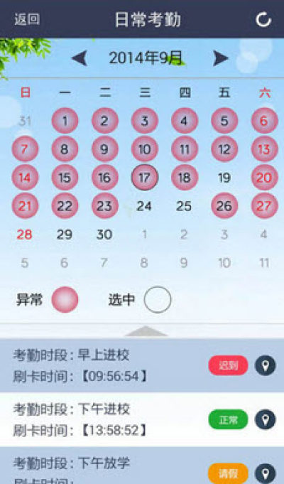 2.考勤记录:与学校考勤系统关联,同步学生在校考勤信息