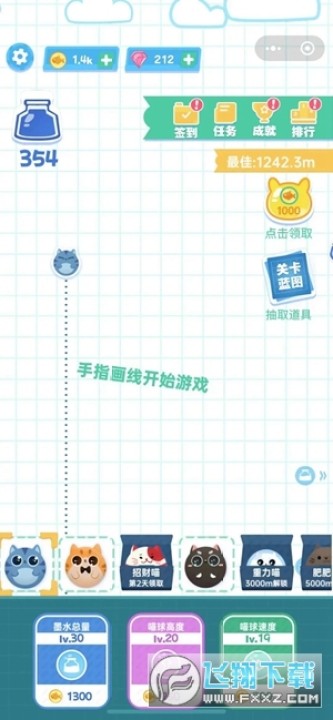 喵上云霄这款游戏非常有创意,玩起来非常有趣,游戏的画风很小清新,给玩家带来一场精彩的视听盛宴。游戏操作简单,老少皆宜,玩家在这里这里需要用有限的墨水画出一条跑道,让猫咪在上面跑酷,尽可能收集更多的墨水和其他有用的道具,这样才能让你在游戏中跑的更远,得分更高。