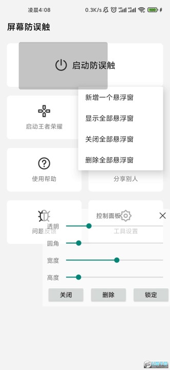 屏幕防误触是一款基于悬浮窗拦截点击区域原理的防误触工具,能够支持用户自定义悬浮窗来遮挡误触区域,在游戏或其他场景中屏蔽易误触区域。用户可以新建多个悬浮窗,并且可以长按悬浮窗来弹出控制面板调节该悬浮窗的宽高、位置、透明度、圆角等参数,悬浮窗配置会存储到本地,下次启动直接恢复。同时支持对悬浮窗配置的删除、管理等操作。