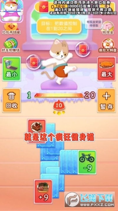 疯狂健身猫是一款萌系的赚钱游戏,疯狂健身猫中是有很多的道具帮助你的猫咪去运动的,玩家们在疯狂健身猫中是可以获得超级宝箱的,这款游戏是有很多的玩法可以体验的,在这款疯狂健身猫游戏中是可以点击猫咪进行互动的,游戏比较的Q治愈的。