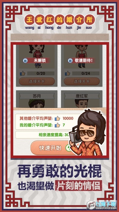 开一间婚介所,最重要的是啥,客源!钻石王老五?高配刘德华?民间嘴炮司机?以及性感的乘务员?数十种人物以及搞笑对白等你来解锁,了解关于他们的爱恨情仇
