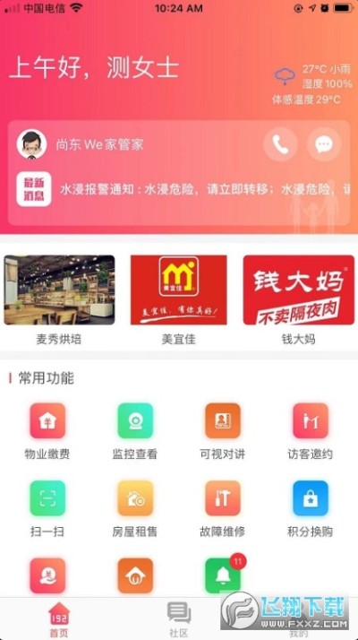 物业缴费,水电缴费,访客邀约,故障维修,物业物务,通知公告。
