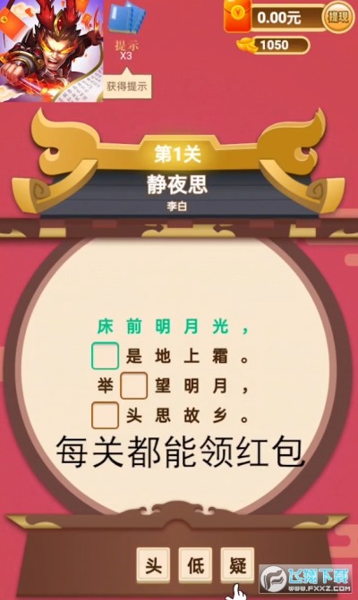 新吕布战诗词是艾睿普斯旗下热门赚钱游戏,吕布战诗词的全新版本,在丰富了更多的关卡同时,游戏提供多种赚红包的方式,诗词填字,过关获得金币元宝,都能够兑换现金红包提现而出。