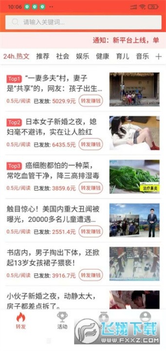1、新用户下载注册皮皮转app就送0.5元,转发文章单价0.5元/阅读,高价时段达0.55元