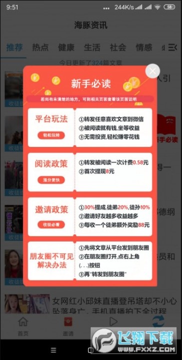 1、新人下载填写邀请码奖励1元,转发文章单价0.58元一次,支持上传文章