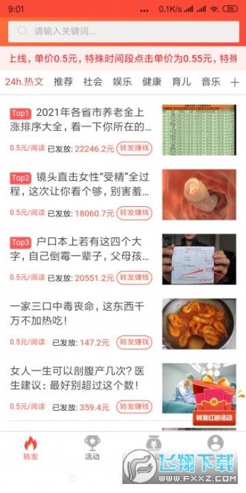 2、登录成功就有0.5元现金奖励,转发文章单价0.55元/阅读,特殊时间段0.55元/阅读