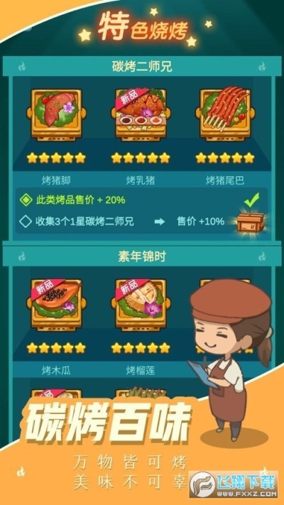 3.从而轻松打造出更美味的食物。提高烧烤技能,完成不同的烧烤任务,获得更多游戏奖励。增加收入,招聘员工。