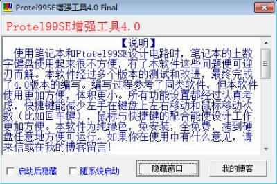 复制到硬盘的任何地方,然后运行软件,出现软件界面,点击“隐藏窗口”按键,就可以在Protel99se中使用本软件所有功能。
