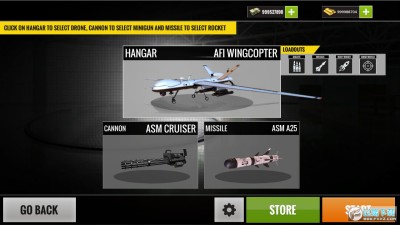 你需要操控自己的无人机,到达指定的地方完成你的任务,你可以合理的利用机枪,导弹等武器对目标进行有效的打击,不同的飞机携带的导弹数量和种类都不相同,需要用通关后获得的金币购买或者升级。