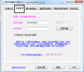 使用:设置好热键后,使输入目标获得输入焦点(即点击视听说里的USER NAME,让光标在里面闪烁,等待键盘的输入),然后按下热键,程序会模拟键盘开始输入用户名和密码。
