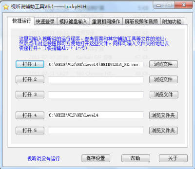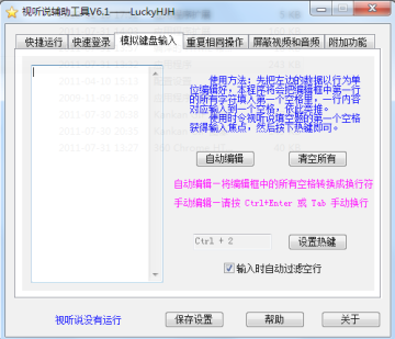 视听说是一款支持快捷运行,快速登陆,模拟键盘输入,重复相同等功能,专为“新时代交互英语视听说软件”度身定做的辅助工具,是在使用视听说时的好帮手。