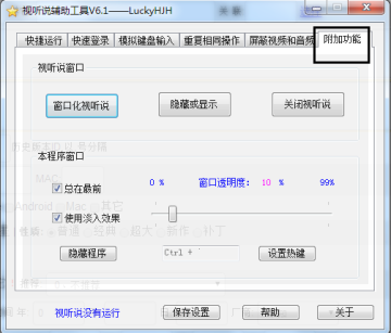 窗口透明度:能修改本程序窗口的透明度,取值范围0~99,当为0的时候不添加透明属性。当本程序窗口透明时有可能与其它窗口发生冲突,导致无法正常显示,解决方法有二:一、使这两个窗口不重叠;二、透明度设为0,保存设置后重启程序。