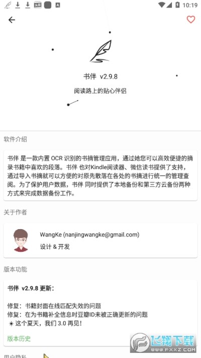 为了保护用户的数据安全,书伴同时提供了本地备份和基于WebDav协议的云备份来完成应用数据备份工作, 因此使用书伴您不需要担心开发者跑路数据丢失的问题,因为所有的数据全都握在您自己的手中。书伴提供了丰富的书摘导出功能,使用她你可以快捷的把书摘导出到印象笔记、MarkDown、纯文本。同时 书伴 也是一款不用担心某天会变404的应用! 书伴 的运行不需要后台服务的支撑,没有构建用户系统,更不会有令人讨厌的广告!