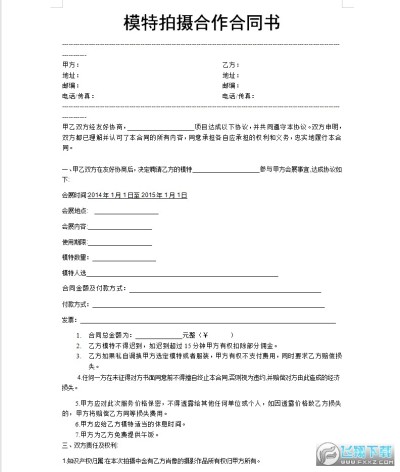 模特拍摄合作合同书:不少公司会选择雇佣模特进行拍摄合作,那么在雇佣前双方需要签订模特拍摄合作合同,规定好工作时长时间薪酬等等事项,今天小编就为大家带来模特拍摄合作合同书范本,有需要的话不妨点击下载!