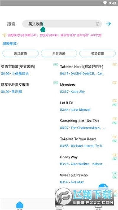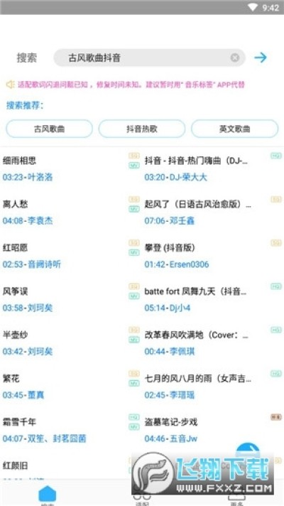 5、搜索推荐:古风歌曲、抖音热歌、英文歌曲,带你发现热歌。
