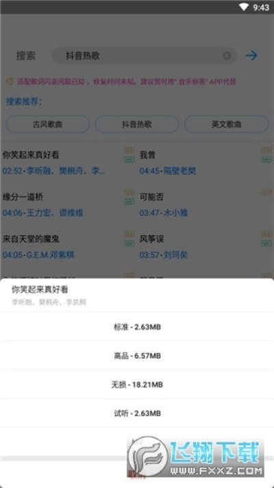 3、在搜索框里试了下搜歌。提供多种品质下载,最高有无损音质,效果看图