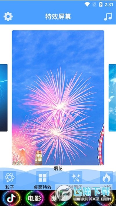 2.夜幕下的城市上空的闪电,丰富多彩的海底世界有趣的泡泡,绚丽多彩的烟花效果等等,还有逼真的【火焰】和魔幻般的【粒子】屏幕效果