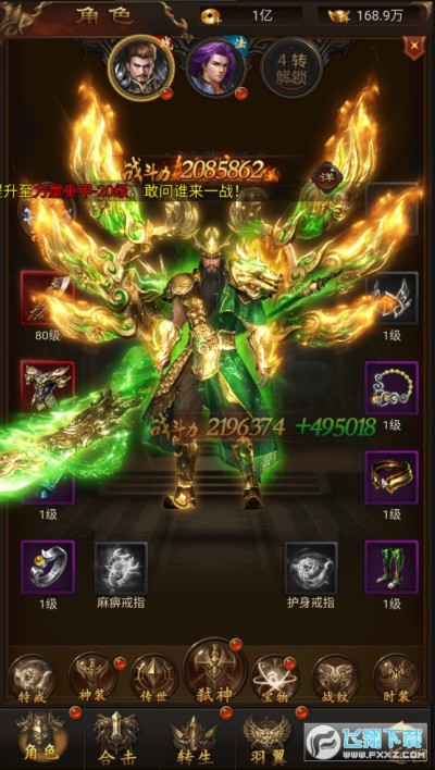 《荣耀战争-武圣0氪打金》上线送满级VIP,100W元宝,99999999金币,武圣关羽体验时装套,两万充值卡,永久时装套。