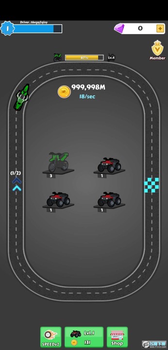 玩家可以通过使用赛道中间的格子进行合成,需要将合成出的最高级别赛车放到赛道中即可产生金币,玩家可以购买新的格子或者赛道来提高自己的金币产生速度。