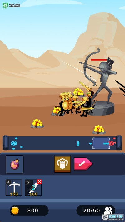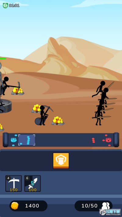 火柴人之战安卓版是一款火柴人题材的策略战争类手游,游戏采用竖屏的策略战争类玩法,玩家们可以招募矿工挖矿获取金币,使用金币解锁不同的火柴人士兵,自由的搭配不同的阵容击败所有的敌人赢得胜利,喜欢的小伙伴们快来试试吧!