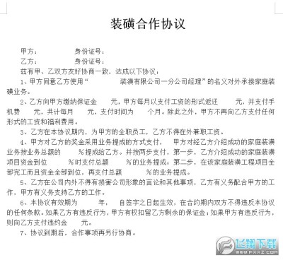 本篇《装磺合作协议》主要是针对家庭装潢所编辑的样本书,甲乙双方可以经过协商,根据样本内容结合实际情况来甲乙修改和使用。有装潢需求的可以参考本篇文档。