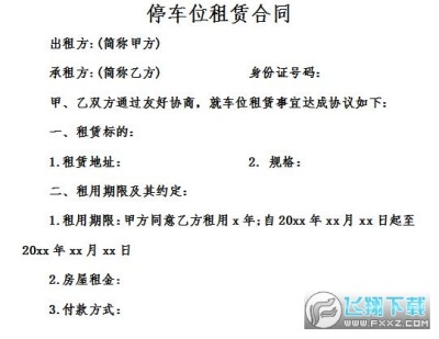 小区车位租赁合同是指当事人一方将特定设备交给另一方使用,另一方支付租金并于使用完毕后返还原物的协议。小区车位租赁合同免费版由华军软件园为您提供免费下载,源文件为docx格式,方便用户自行编辑。更多关于小区车位租赁合同免费下载,欢迎关注飞翔下载。