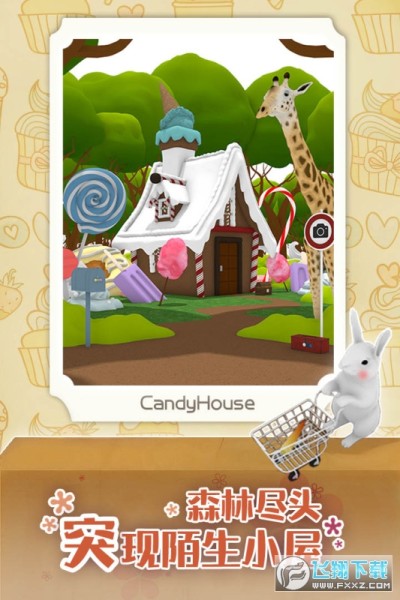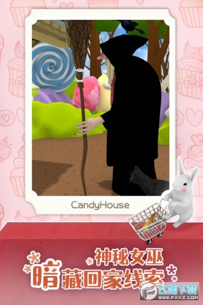 2、格蕾特发现自己在一个充满各种糖果的魔法森林,看起来很好吃的房子,可爱的动物居民,神秘的黑衣女巫;