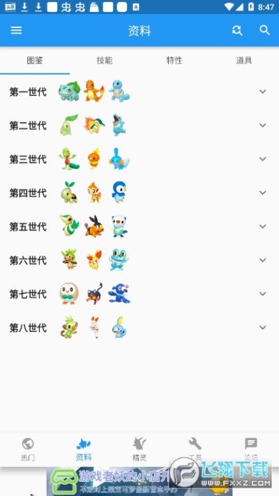 1.程序将所有世代的宝可梦们的数据全部记录,并且根据不同世代来进行分类,玩家可以直接点击对应的世代来查看自己游玩的游戏世代版本的宝可梦们的数据;