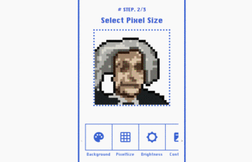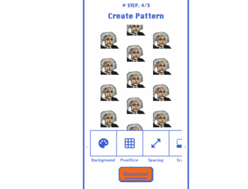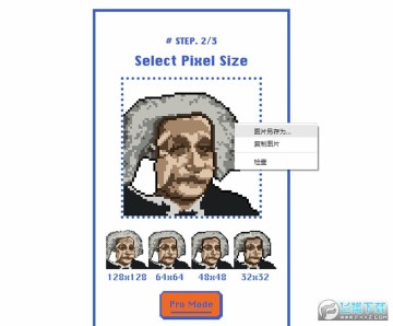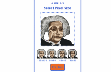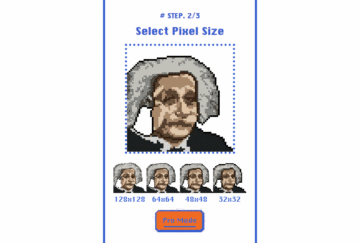 我上传了一张爱因斯坦的图片之后,开始自动生成,生成成完毕之后自动滑动到了 Step.2「Select Pixel Size(选择像素尺寸;)」。在这一步我们可以选择不同的像素,也就是这张图片由多少个像素点组成,效果如下: