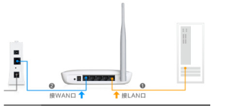 请按下图蓝色网线所示,一端插入ADSL Modem的LAN口或者其他互联网接口,另一端插入路由器的WAN口