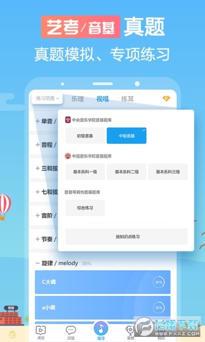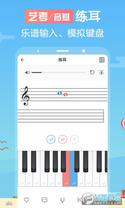 9、 丰富全面的学习练习内容,包含了音符、音阶、键盘、音程、和弦、节奏、旋律、调式等多种内容。
