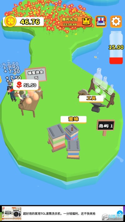 3、蜂蜜在产出之后就会自己去换取金币,之后就可以拿去提升规模和购置工具了;