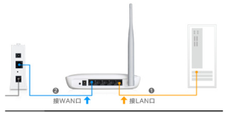 请按下图蓝色网线所示,一端插入ADSL Modem的LAN口或者其他互联网接口,另一端插入路由器的WAN口
