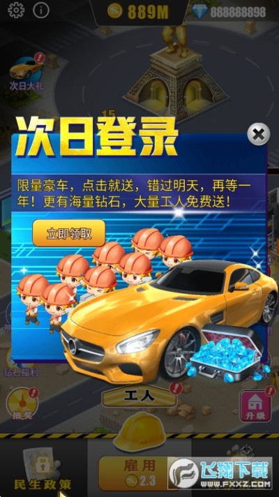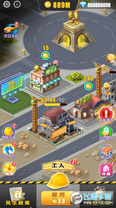 模拟城市我是首富是一款模拟类的游戏。用户将会变成一个地产大亨,你会拥一块属于自己的地基、你需要不断的招募工人,建造属于你的房子,每一个房子的作用不同带给用户的报酬也是不一样的。快来这里当个老板试试你能不能赚零花吧。
