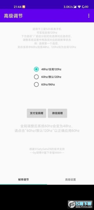 高级调节全局120这是一款免费的安卓手机帧率更改工具,可以让您从多种帧率中进行选择,简单易用,操作简单。支持三星、小米等多款手机,让游戏娱乐更便捷!这款工具非常的不错哟!